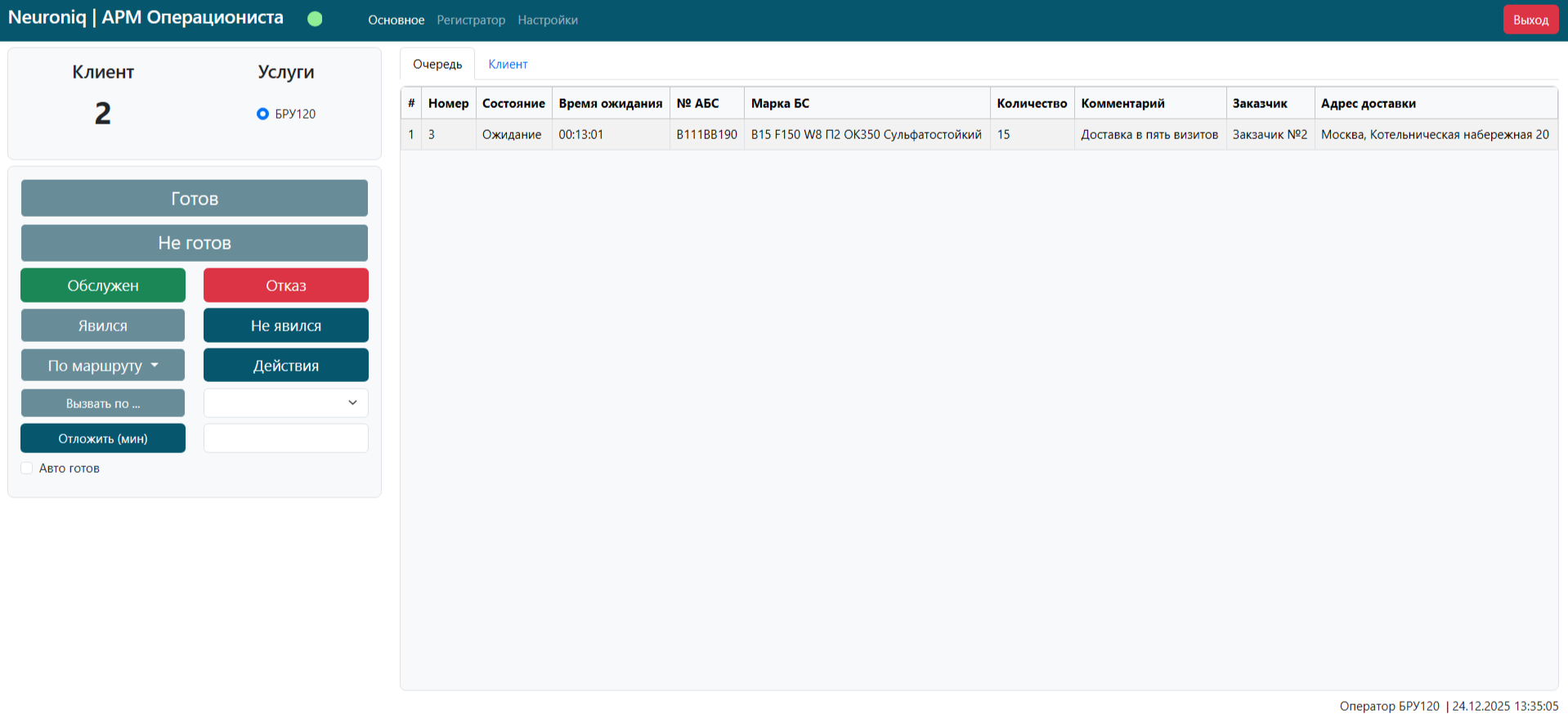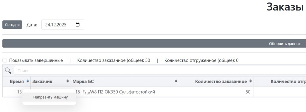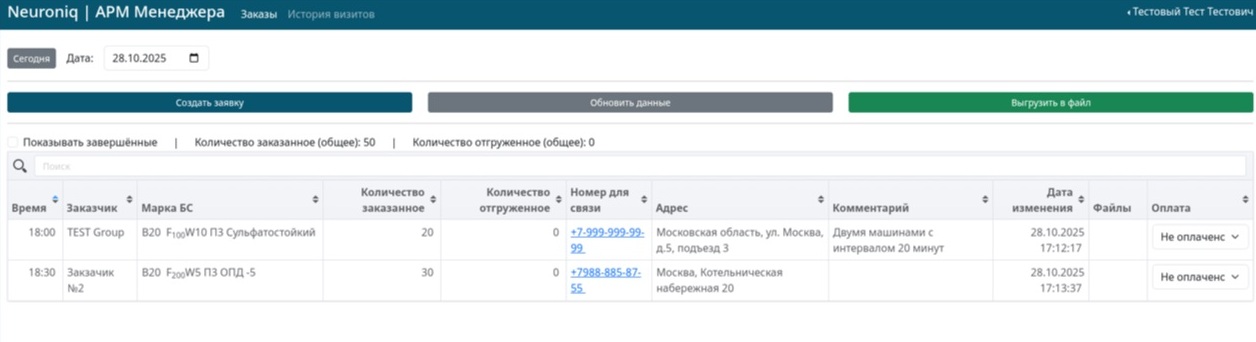 - При регистрации приезда миксера на завод, информация о машине, Заказе и визите появляется в интерфейсе оператора завода. По готовности, он вызывает машину к месту погрузки, отмечает момент ее окончания. В этот момент визит закрывается, он исчезает из интерфейса диспетчера, а количество кубов бетона указанных в визите вычитается из остатков кубов Заказа. Когда в Заказе кубов не останется, он считается закрытым и становится неактивным для формирования по нему визита. История о завершенных визитах появляется в интерфейсе менеджера во вкладке «История визитов».