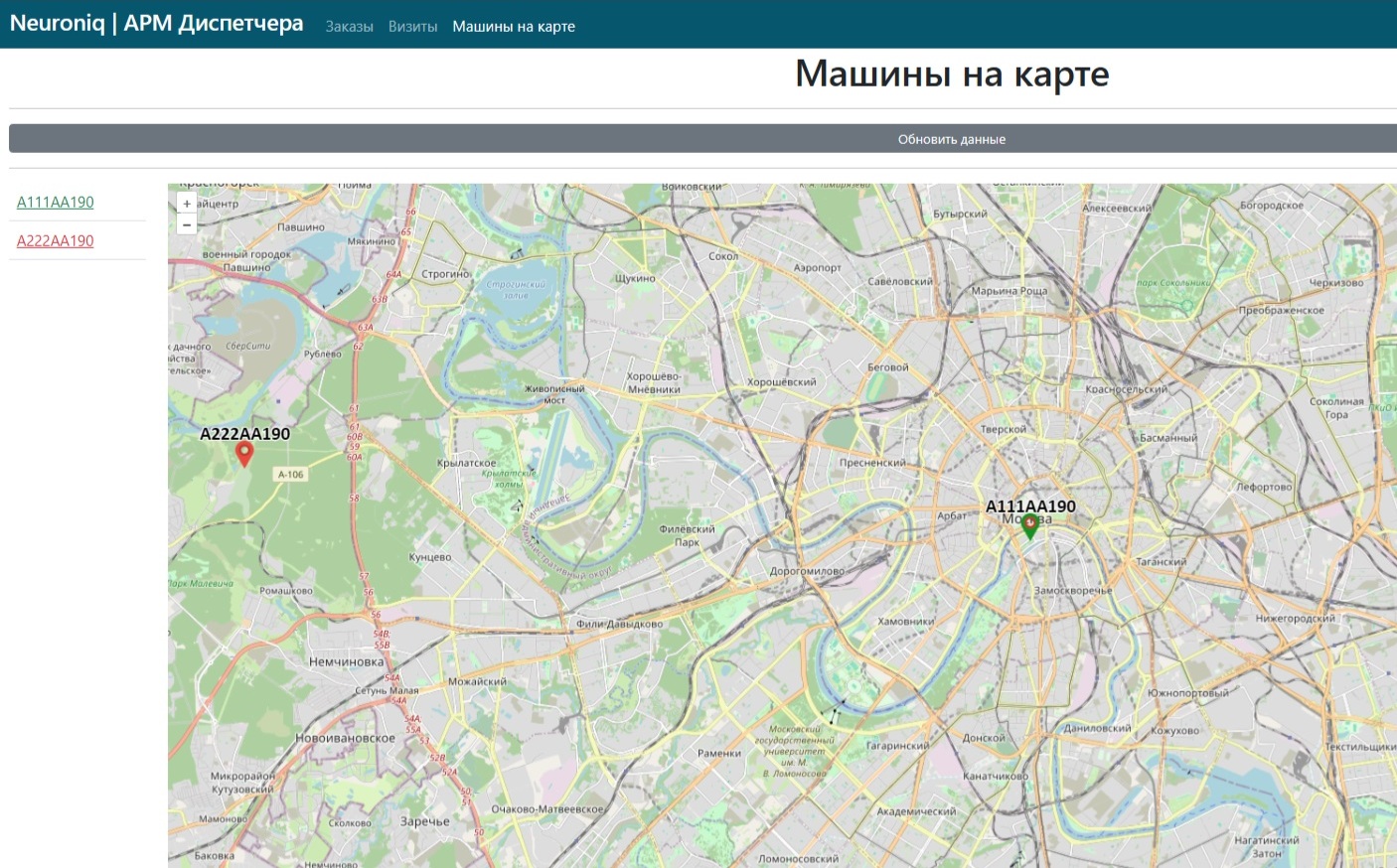 4. Интерфейс диспетчера – вся логистика в «одном окне». В этом интерфейсе диспетчер создает визиты (задания) на погрузку и доставку бетона на основании заказов, созданных менеджерами и распределяет их по машинам. Для эффективной логистики интерфейс оснащен вкладкой «машины на карте», где диспетчер видит местоположение миксеров и их текущий статус. Он выбирает подходящую и назначает ей визит (задание), водитель видит его на своем устройстве, принимает, меняя статус в своем приложении.