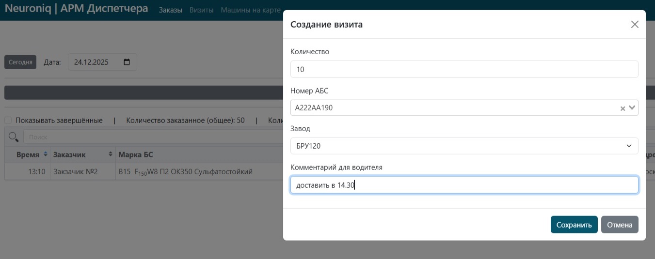 - Сформированные Заказы видны в интерфейсе диспетчера, для них он может назначить задание/визит. Диспетчер должен сначала решить – для какой машины он будет назначать этот визит. В своем интерфейсе он открывает вкладку «Машины на карте» и видит все активные миксеры и их текущие статусы. Определившись с выбором миксера, диспетчер создает для него визит, где указывает количество кубов и завод, на котором надо будет загрузиться. Из визита диспетчер может автоматически сформировать и распечатать накладную для водителя.