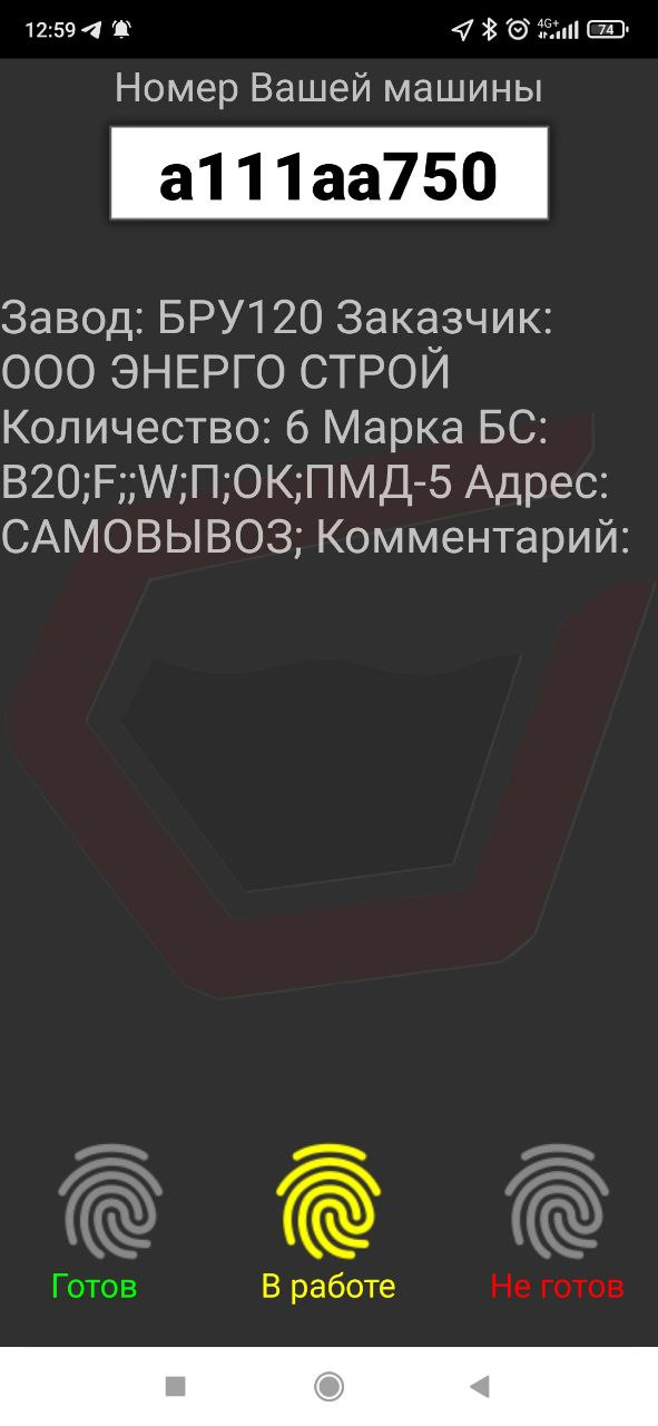 - Водитель, готовый принять новое задание/визит, ставит в приложении Last-Mile статус «Готов», диспетчер видит это в своем интерфейсе «Машины на карте» как изменение цвета ярлыка и ссылки на зеленый, и назначает машине задание/визит. Информация о визите отображается в приложении Last-Mile водителя, он берет его в работу, изменив статус на «В работе». В этот момент ярлык и ссылка машины на карте диспетчера перекрашивается в красный цвет. Все время, от принятия задания/визита до выгрузки бетона в пункте назначения водитель сохраняет статус «В работе». По окончании выгрузки, т.е. выполнения задания, водитель меняет статус на «Готов» для получения нового задания, либо «Не готов», тогда последнем случае он пропадет с карты диспетчера.